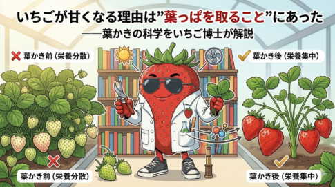 いちご博士と学ぶ「一粒の真理」いちごを愛するすべての諸君。 いちごを甘くするために、農家がしていること——それは水やりでも肥料でもなく、「葉っぱをちぎること」だと聞いたら、驚くだろうか。 葉かきとは、いちごの葉を意図的に取り除く作業のことじゃ。一見す...