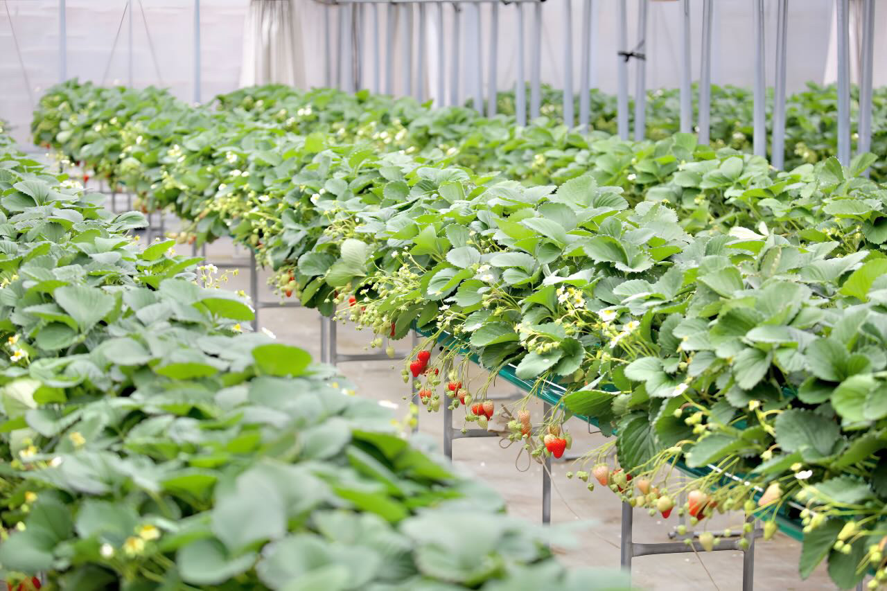 当園のいちごは、大人の腰くらいの高さに設置された棚で育てる「高設栽培」を採用しています。